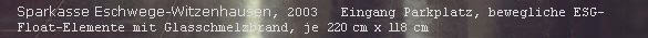 Sparkasse Eschwege-Witzenhausen, 2003, Eingang Parkplatz, bewegliche ESG-Float-Elemente mit Glasschmelzbrand, je 220 cm x 118 cm