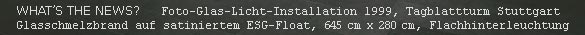 WHAT'S THE NEWS?  Foto-Glas-Licht-Installation 1999, Tagblattturm Stuttgart, Glasschmelzbrand auf satiniertem ESG-Float, 645 cm x 280 cm, Flachhinterleuchtung